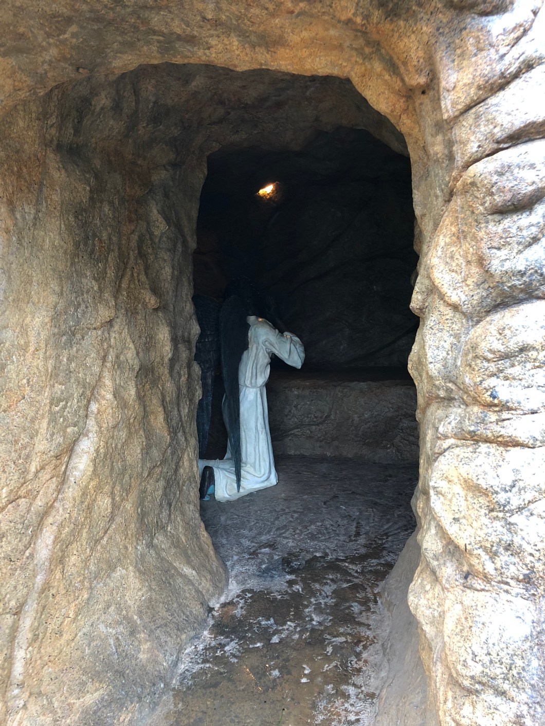 The last supper scene isn’t in the circle, it’s off to the side and behind that up some stairs are the three crosses. At the foot of Jesus’s cross, I’m not sure if it was meant to be this way, but there are broken flat rocks all around and visitors have written messages or signed their names thanking Jesus for what he has done. It was raining a bit the day I went so I was being helpful to everyone and trying to find dry rocks and a sharpie for them to write messages. Or else I would’ve been like, “No, these aren’t tears, they’re raindrops that keep falling into my eyes and then down my face” Underneath the crosses is the open cave where Jesus rose. You can walk inside.