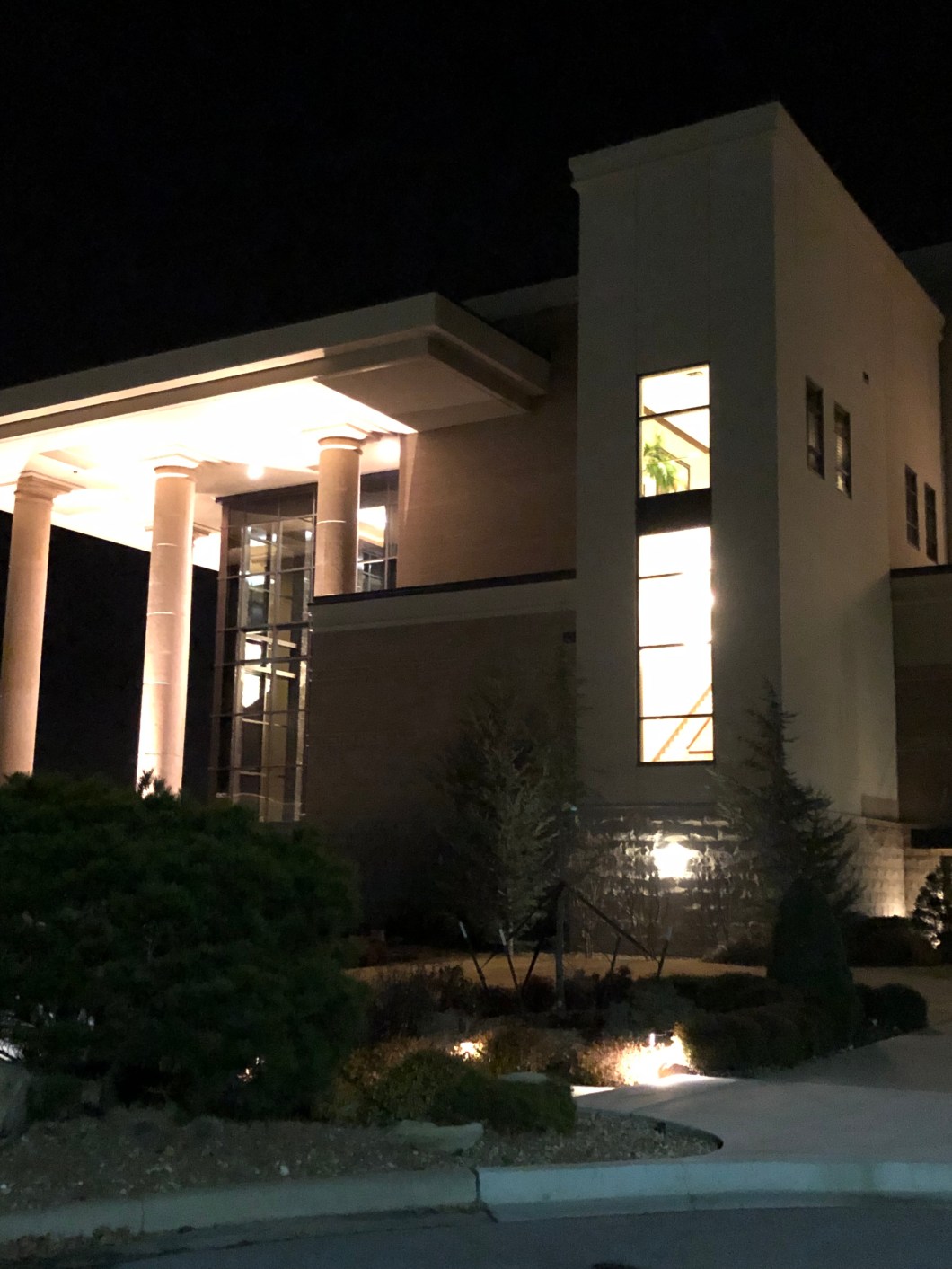 It’s called Armstrong Auditorium and is located right outside of Edmond in what looks like the middle of nowhere. When we arrived it was already dark and there didn’t seem to be anything else around except for another big building across from it and a few houses on the other side of the road. I’ve never been to this place before and it looked fancy af. Pillars, glass, and giant chandeliers. It’s my new favorite place. This is what I saw when we drove up.