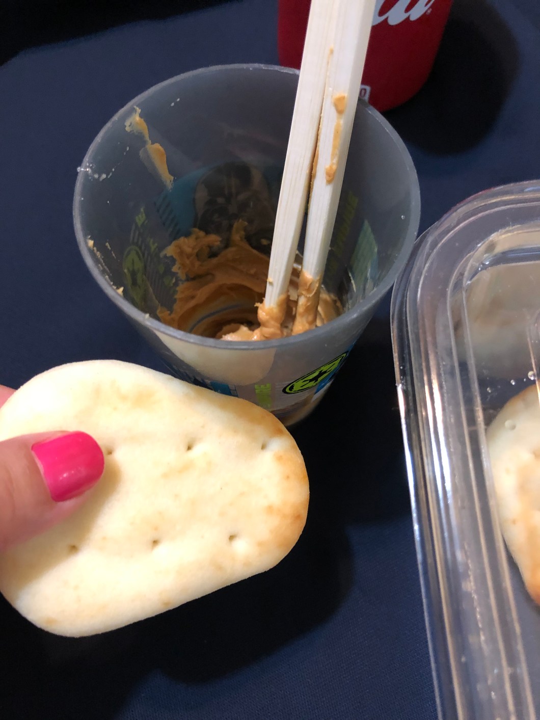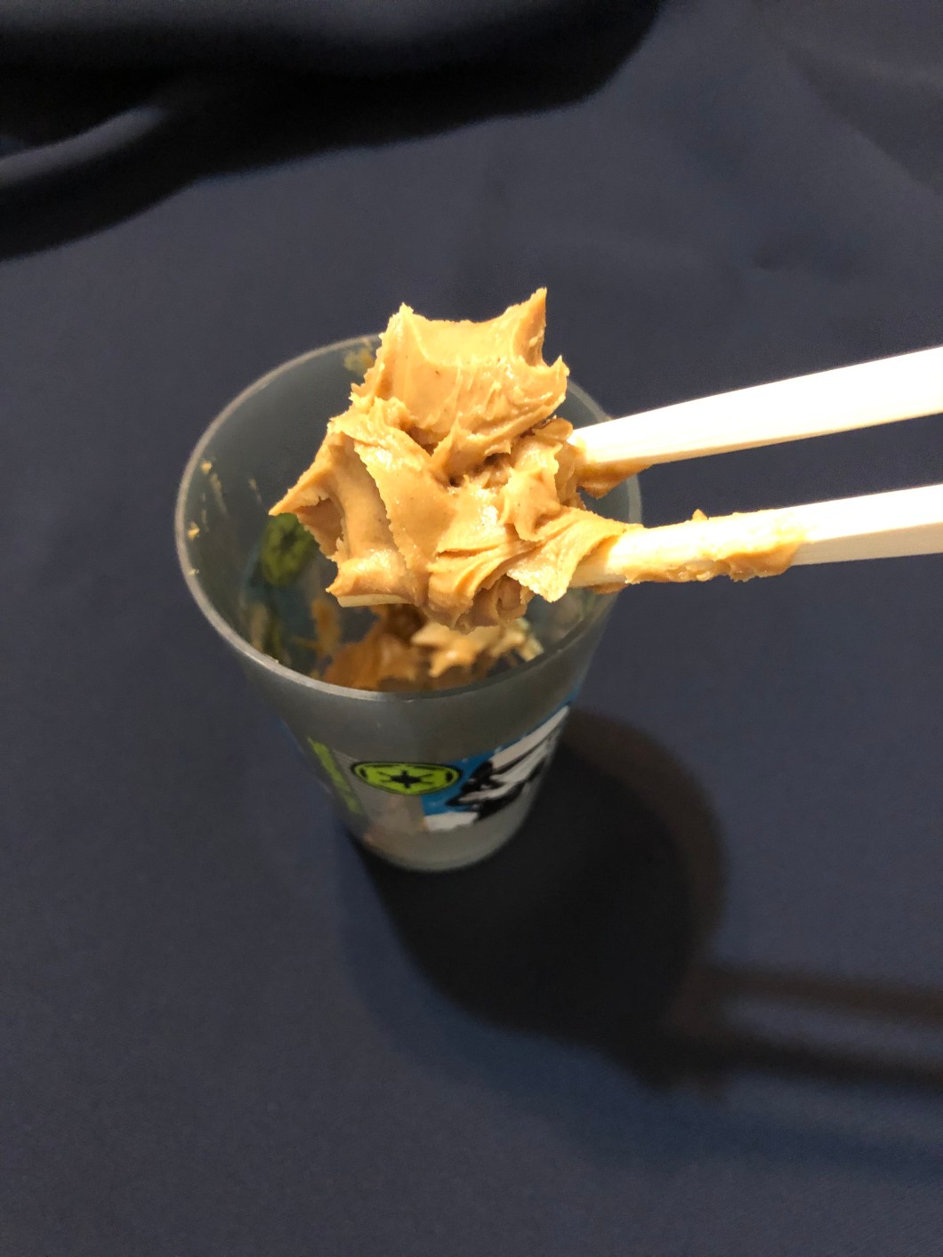 Using chopsticks to scoop out peanut butter from the jar and to spread on little pita breads.