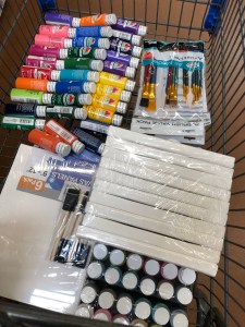 I kept the same party time but told everyone to come to my place instead. I slept late so by the time I got around to shopping for paint supplies it was afternoon. And the party was at 4:00! Quickly went to Walmart and had fun throwing all kinds of paint colors into the cart.