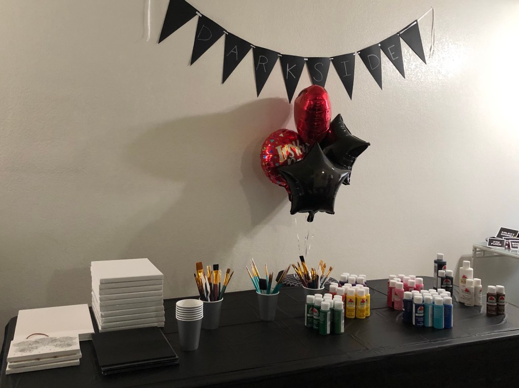 At the coffee shop paint party, the guests all paint the same picture in a two hour time slot. I chose Kylo Ren because he’s my fav. But the guests could always paint something different if they wanted. At home it was a total free for all. And it lasted until 10:00 pm. And that was only because a few guests had to be at work by 7:00 am. Otherwise we would’ve been painting well past midnight.